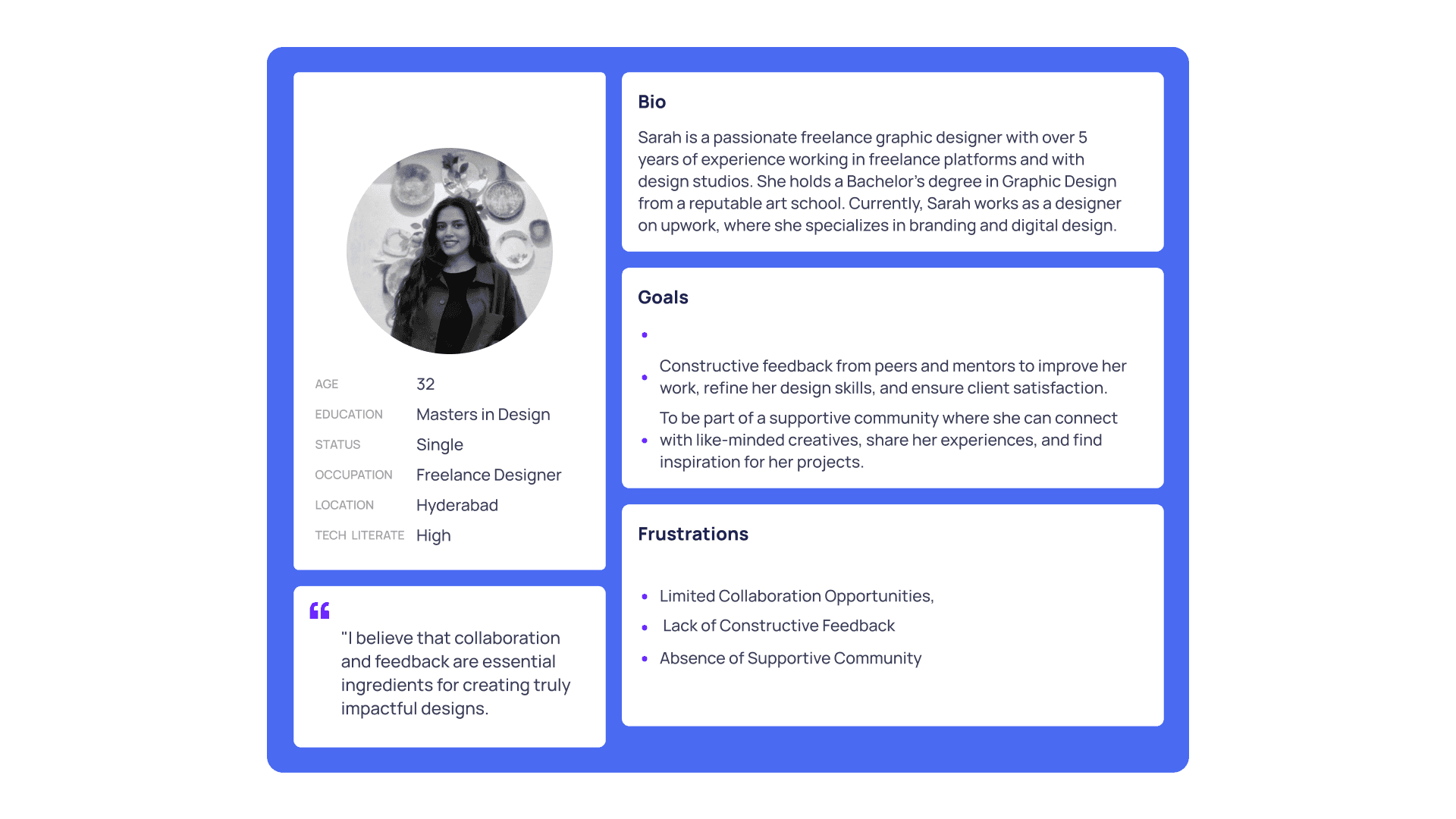 While designers struggle to find peers or developers to bring their ideas to life, developers face difficulty sourcing well-structured design concepts for their apps. Additionally, both groups lack a central platform to connect, share, and collaborate meaningfully. Survey and interview data revealed that: